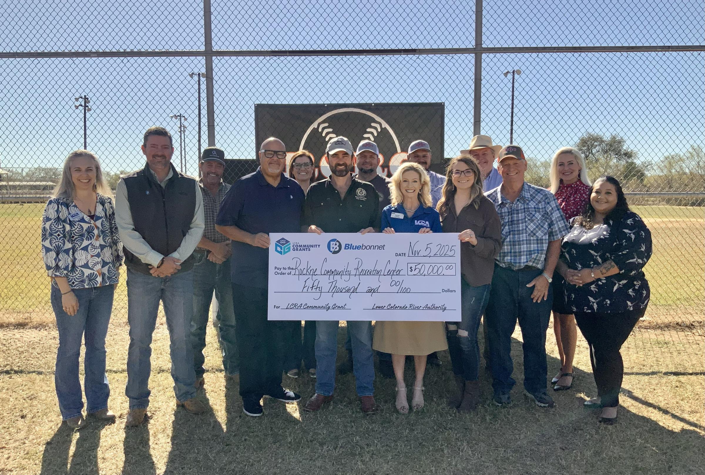 Bluebonnet and LCRA representatives present a $50,000 grant to the Rockne Community Recreation Center for new baseball field lighting. The grant is part of LCRA’s Community Grants program. Pictured, from left, are Elizabeth Ehlers, LCRA regional affairs representative; Josh Thomas, Bluebonnet’s Bastrop-area community representative; Matthew L. ‘Matt’ Arthur, LCRA board member; Roderick Emanuel, Bluebonnet Board Vice President/Vice Chairman; Melissa K. Blanding, LCRA board member; State Rep. Stan Gerdes; Marty Mercer Sr., recreation center president; Margaret D. ‘Meg’ Voelter, LCRA board member; Josh Almendarez, recreation center field commissioner; Paige Cox, recreation center vice president; Mark Mayo, LCRA board member; Al Bauer, recreation center member; Stacy Kazmir, recreation center secretary; and Gabriella Almendarez, recreation center treasurer.