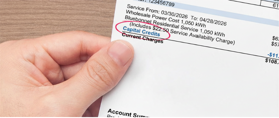 Bluebonnet Electric Cooperative will return $11.9 million in capital credits in 2026, an increase of $778,000 over last year. Bluebonnet’s members will see a reduction on their May electric bill as a result of the capital credits approved by the Board of Directors during its April meeting.
